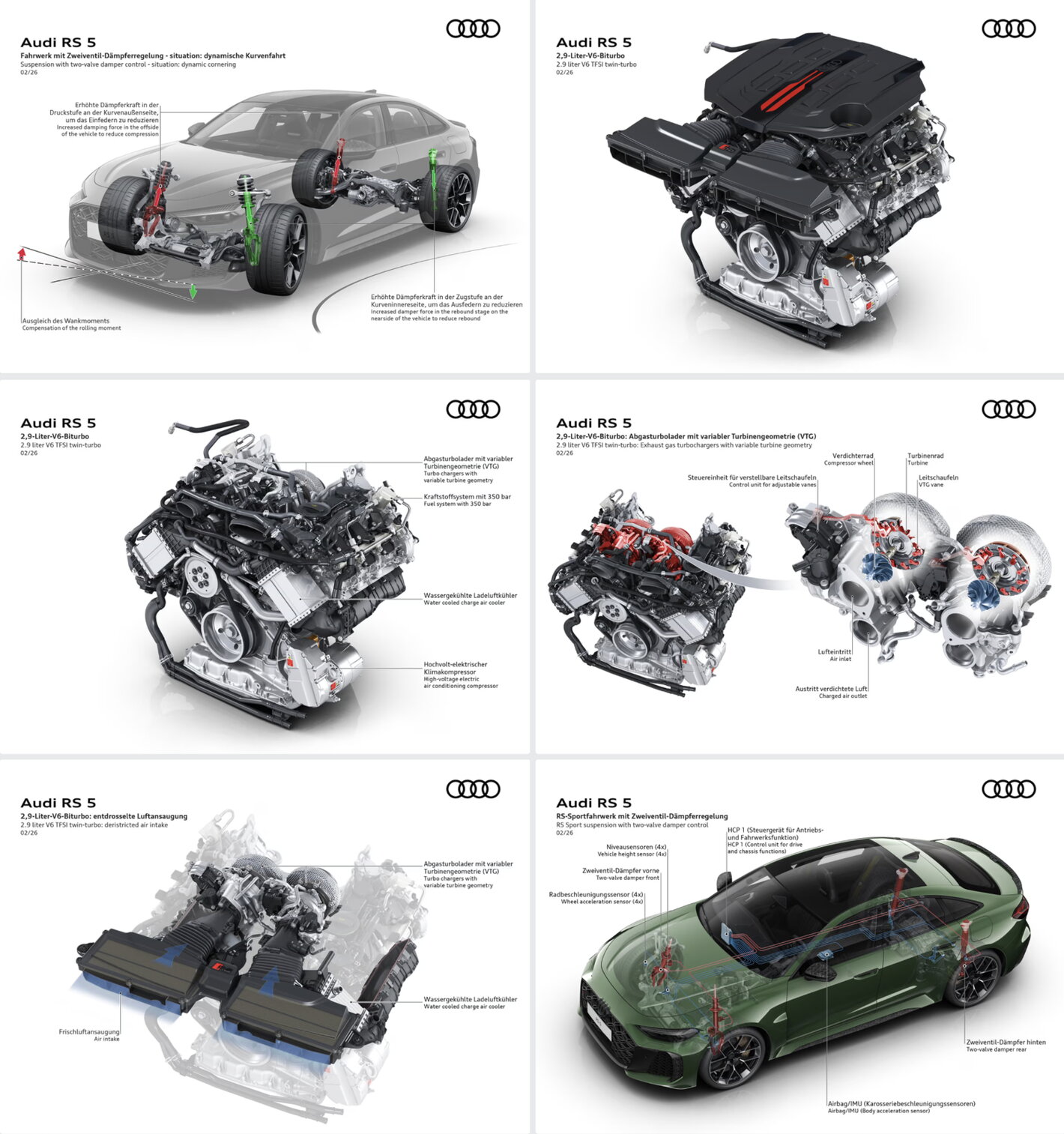 Avec une puissance de 375 kW (510 ch), le moteur V6 TFSI de 2,9 litres amélioré de la RS 5 apporte nettement plus de puissance que la génération précédente. L’augmentation de 44 kW est le résultat du développement continu, axé sur les performances, réalisé par Audi Sport. La RS 5 utilise un cycle Miller modifié qui offre des avantages significatifs à charge partielle. Dans le cycle Miller, les soupapes d’admission se ferment plus tôt, ce qui augmente le rendement du moteur.