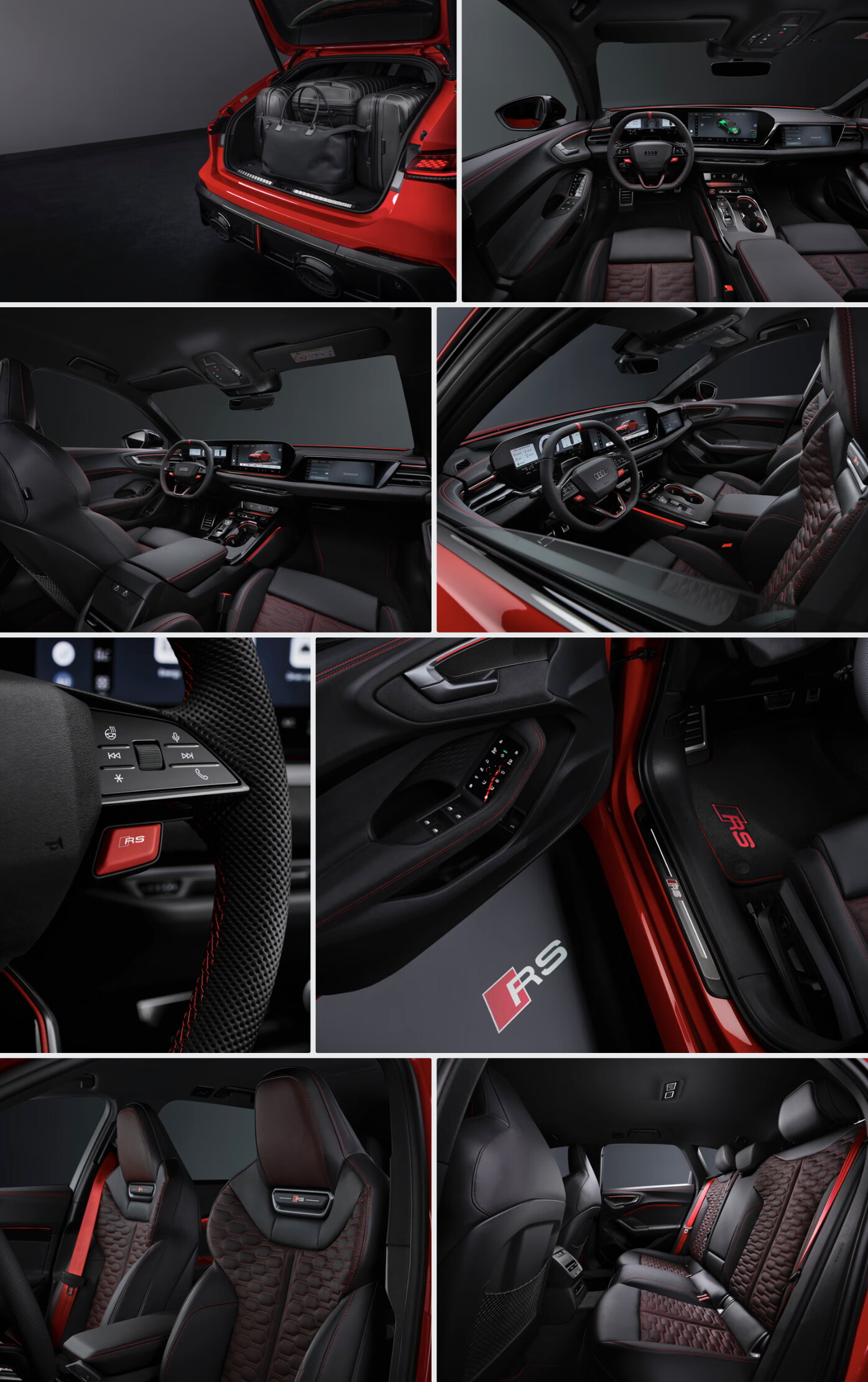 Les surfaces rehaussées dans tout l’habitacle, finies de série en vanadium métallisé foncé, contribuent à l’ambiance sportive. Elles comprennent les palettes de changement de vitesse, l’emblème Audi et l’insert du volant, les poignées de porte, les inserts de seuil de porte, les ouïes d’aération et, en exclusivité pour la RS, les garnitures de cadre de siège éclairées avec le logo RS.